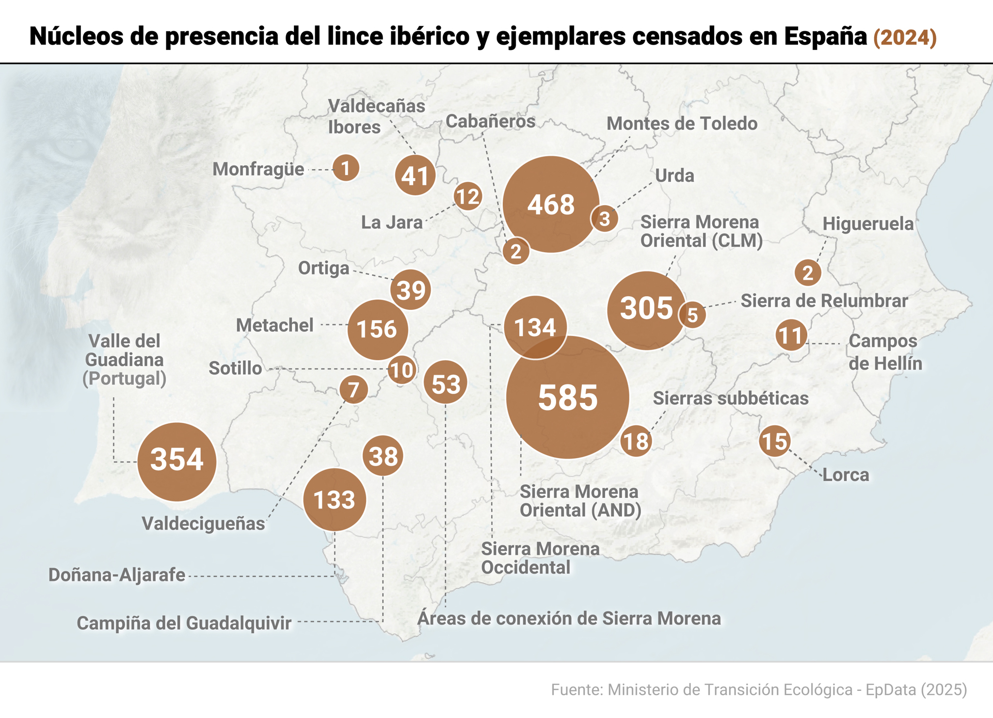 De esta población total, España alberga el 85,3% con 2.047 linces, mientras que Portugal apenas suma 354, lo que representa el 14,7% restante. En España, cuatro comunidades autónomas cuentan con poblaciones sostenibles de linces: Castilla-La Mancha, Andalucía, Extremadura y la Región de Murcia. Castilla-La Mancha destaca como la región con mayor población, con 942 linces (46% del total español), seguida por Andalucía con 836 ejemplares (40,8%), Extremadura con 254 y Murcia con solo 15.